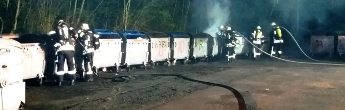 Umfangreicher Einsatz für die Feuerwehr am Abend des Mittwoch (22. März): „Brennen mehrere Mülltonnen im Schuldorf Bergstraße“ lautete das Stichwort bei der um 21.34 Uhr erfolgten Alarmierung. Auf Grund dessen rückten unter anderem gleich mehrere Löschfahrzeuge zur Einsatzstelle aus. Beim Eintreffen der Feuerwehr stand auf einer Freifläche bereits der Inhalt von sieben metallenen Abfallcontainern sowie ein Container aus Kunststoff in Vollbrand. Noch während der Löscharbeiten wurde ein weiteres Feuer an einem benachbarten Gebäude entdeckt. Hier brannten Plakate und Transparente. Durch einen massiven und umfassenden Löscheinsatz der Feuerwehr – teilweise mit Löschschaum – konnte eine Ausbreitung der Brände verhindert werden. Nachlöscharbeiten nahmen noch etliche Zeit in Anspruch, so dass das das letzten Fahrzeug mit Mannschaft erst um 22.40 Uhr wieder einrücken konnte. Insgesamt waren 24 Einsatzkräfte mit sieben Fahrzeugen an der Einsatzstelle, des Weiteren auch zwei Streifen der Polizei, die auch bezüglich der Brandursache ermitteln wird.