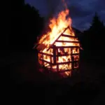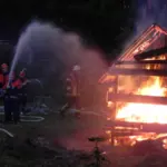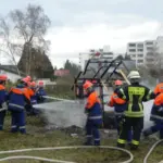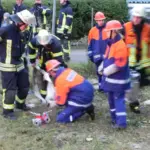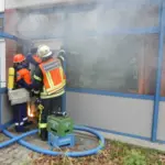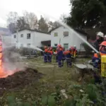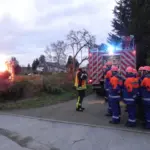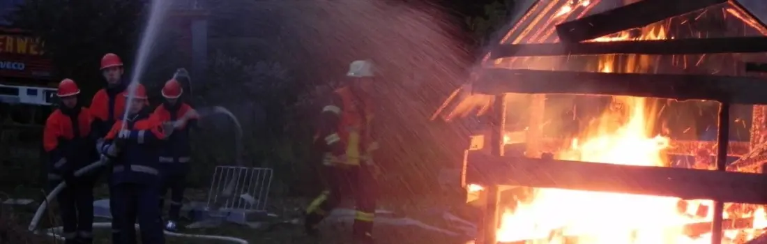 Kaum, dass die Gerätschaften wieder in den Fahrzeugen verstaut waren und sich die Jugendlichen mit heißem Tee etwas aufgewärmt hatten, erfolgte eine erneute Alarmierung unter dem Stichwort „Brand einer Gartenhütte westlich des Niebergallgallweges“. Dort hatte man im Vorfeld eine stilisierte Gartenhütte errichtet, die dann zum Übungszweck in Brand gesetzt wurde. Zum einen galt es, eine vermisste „Person“ aufzufinden, zum anderen´wurde gekonnt ein Löschangriff aufgebaut und mit drei Rohren rückte man dem Feuer anschließend massiv zu Leibe, so dass sich nach kurzer Zeit der gewünschte Löscherfolg einstellte und auch die vermisste „Person“ gefunden wurde.