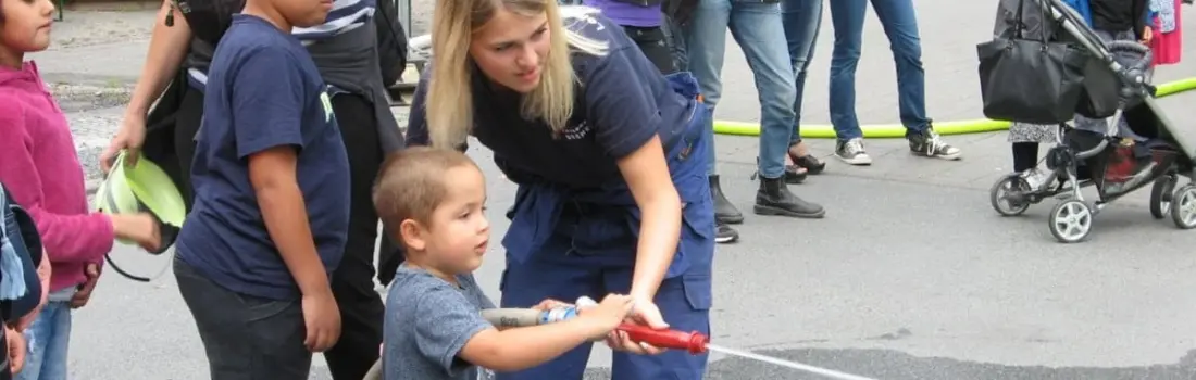 Neben einem Informationsstand wurde für die kleinen Besucher des Weltkindertages auch feuerwehrtechnisch etwas geboten: Zielspritzen auf Fallklappen und einen Ball mittels Wasserstrahl eine schräggestellte Leiter hinaufbefördern, was einiges Geschick erforderte.